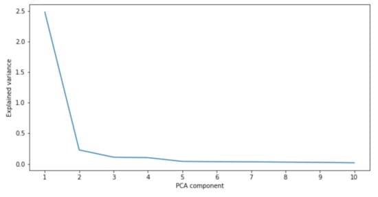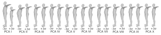 It is not completely surprising that height and weight strongly correlate with the body measurements for the statistical model population. The previous works, such as [,], analyze the principal components of the SMPL and SCAPE [] statistical body models, respectively. They add several standard deviations separately to each principal component of the mean shape. The resulting explained variance for the first 10 components is shown in Figure 5, and the variation in shapes are shown in Figure 6. It can be observed that the first two principal components explain most of the variance in body shapes (Figure 5), which in turn define the extreme shape variations visible in Figure 6, particularly in terms of height and weight. Minor variations are visible for the third and fourth components. The remaining components do not significantly influence body shape and measurements. Whether or not these linear relationships hold for the general population, it is currently not easy to verify due to lack of public data. Still, the statistical models are expected to be made from a diverse set of human bodies; therefore, we consider this linear relationship relevant.
