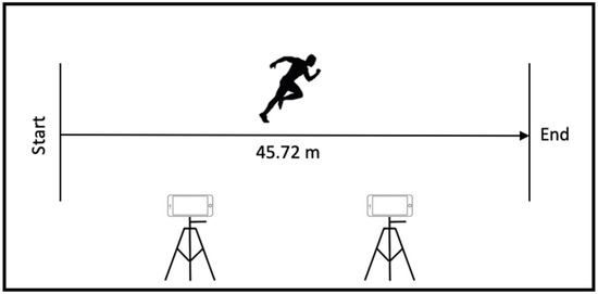 This experiment involved one single visit to the field hockey pitch at the National Institute of Education, Nanyang Technological University, Singapore. GNSS data were collected outdoors without high surrounding buildings to enhance satellite reception [34]. After sufficient warm-up and putting on the strap with 8 GNSS units, participants were asked to perform one straight-line sprint across the hockey pitch with maximum effort (Figure 2). A sprint distance of 45.72 m was chosen as it is exactly half of the hockey pitch with a clear marked line. This distance also allowed sufficient time for participants to reach their peak speed. To help participants discern the start and end points, the sprint area was marked out using colored cones. Participants were asked to run pass the 45.72 m end-line before they could slow down. The sprint test was recorded using two video cameras at 60 Hz for subsequent determination of sprint times and peak speeds. To minimize the effect of camera lens distortion, we used two smartphone cameras to cover the entire 45.72 m range (Figure 2). The midline distance of 22.86 m was used to calibrate each camera (0 to 22.86 m, 22.86 to 45.72 m) as the midline can be clearly seen from both camera views.