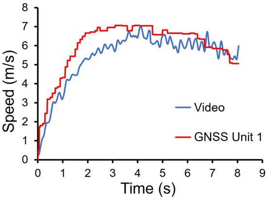 Representative raw speed-time from one participant measured using Kinovea video analysis and one GNSS unit.