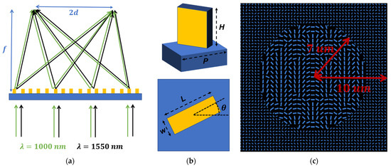 (a) Schematic illustration of the designed dual-wavelength achromatic polarization-dependent bifocal metalens. Transmitted light with the wavelengths of 1000 and 1550 nm can be both focused into the same focal plane transversely. (b) Unit cell with a Silicon nanobrick patterned on the glass substrate. (c) Spatial distribution of two different unit cells.