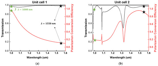 The transmission and PCE of the unit cell 1 (a) and unit cell 2 (b) with wavelengths ranging from 0.98 µm to 1.6 µm. Transmission and PCE are highlighted with green stars for 1000 nm and black stars for 1550 nm, respectively.