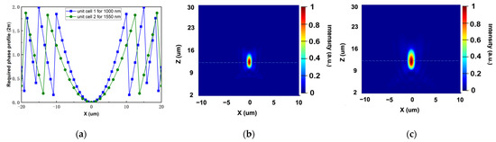where is the focal length of the designed metalens, are the coordinates of unit cells in the whole structure, and is the operation wavelength. Here, a metalens working at 1000 nm uses unit cell 1 and a metalens working at 1550 nm uses unit cell 2. The designed focal length is 12 µm. The required phase profile of two lenses along -axis at is 0 are illustrated in Figure 3a. Based on the two phase distributions, unit cells are spatially rotated with different angles of . The simulated intensity distributions of the x–z plane at equals to 0 of two lenses are also shown in Figure 3b,c. It is clear from the tightly focused spots that both unit cells operate well in single focus metalens design at their specific wavelengths.