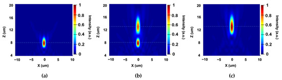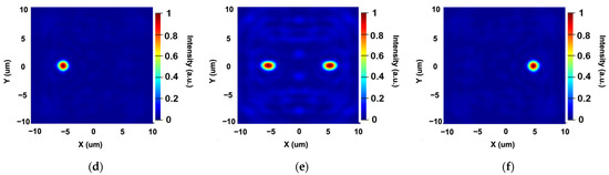 Under the illumination of RCP and LCP, the transmitted light focused exactly at the designed two focal lengths, which are shown in Figure 5a,c. When the linearly polarized (LP) light serves as the incident, bifocal spots are obtained along the z-axis at 8.0 and 13.1 µm, manifesting a polarization-dependent characteristic. With the same processing method, a transverse bifocal design can also be implemented. We will explain the detailed performance of transverse bifocal design in the next chapter.