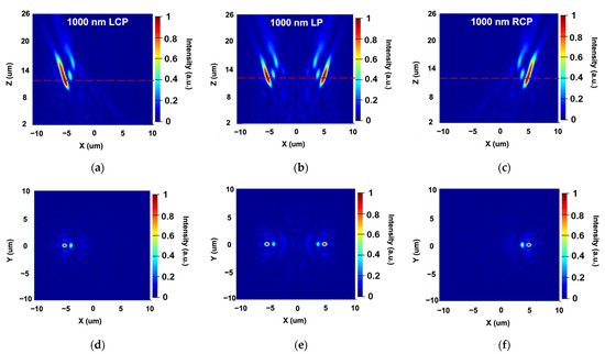 Performance of the dual-wavelength achromatic bifocal metalens at 1000 nm. (a–c) Simulated optical intensity of the proposed metalens with incident wavelength at the x–z plane when y is 0 for LCP, LP and RCP. (d–f) Simulated optical intensity at the x–y plane at the designed focal plane.