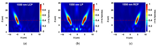 From Figure 6 and Figure 7, it is clear that the foci can be controlled by the incident polarization. When the incident is circularly polarized light, the generated focus appears at the left/right side of the focal plane, representing the chirality of the incident of LCP and RCP, respectively. While two foci will occur when the incident becomes linearly polarized light. Thus, the polarization-dependent bifocusing characteristic can be verified. The performance of the dual-wavelength achromatic focusing is further discussed in Figure 8.