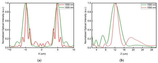 Optical intensity distribution under LP light. (a) Normalized optical intensity along x-axis at the focal plane. Red and green lines stand for different distribution at 1550 and 1000 nm, respectively. (b) Normalized optical intensity along z-direction when is −5 µm and is 0. Red and green lines stand for different distribution at 1550 and 1000 nm, respectively.