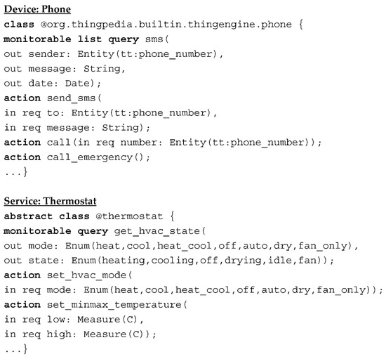 - Thingpedia. Available online: https://almond.stanford.edu/thingpedia (accessed on 19 February 2022).