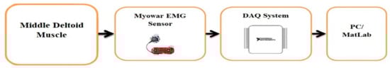 A Myoware muscle sensor was placed on the middle deltoid muscle and used to collect the sEMG signals. The Myoware sensor was previously investigated and displayed its ability to convert the electrical activity in the muscle to an analogue signal [45]. Table 2 summarizes the parameters of the chosen sensor.