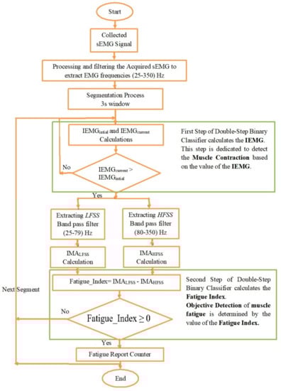 Despite the fact that the assessment of muscle fatigue based on an analysis of the surface electromyography (sEMG) signal has been intensively discussed and understood [4], the objective detection of muscle fatigue still requires further investigation [5]. In medical terms, muscle fatigue is detected either subjectively or objectively [6]. The subjective detection of muscle fatigue is reported by the individuals themselves, when no type of measurement is applied [6]. However, the objective detection of muscle fatigue requires the application of a specific type of measurement to detect the fatigue, which, in the case of this study, involves an analysis of the sEMG signals [7]. Consequently, the objective detection of muscle fatigue disregards any subjective reports by individuals [7], and, furthermore, it identifies the level of exhaustion of the muscle [8]. Hence, the objective detection of muscle fatigue is able to prevent post-fatigue injuries caused by over-training by athletes and rehabilitation exercises for stroke patients [9,10].