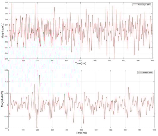 A representation of the non-fatigued and fatigued filtered sEMG signal is shown in Figure 5. The variations between the non-fatigued and fatigued sEMG signals depend on the physiological parameters of the muscle, including the motor unit recruitment, fiber firing rate, fiber type, and the conduction velocity. The amplitude and frequency of the acquired sEMG signal were the main EMG characteristics that were affected by the aforementioned parameters [26].