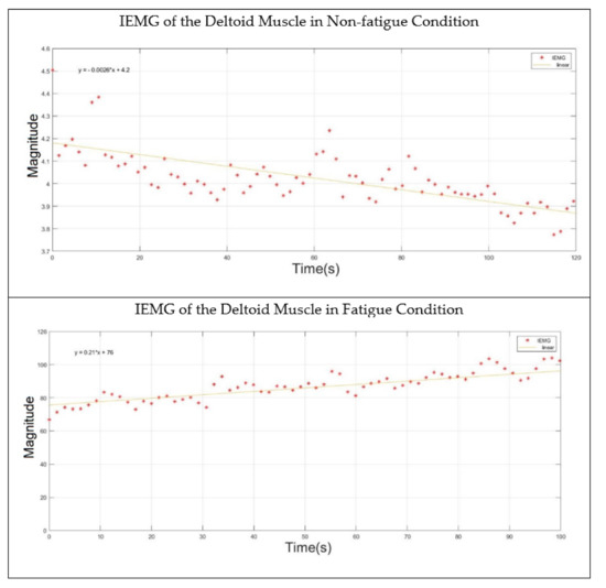The paired two-tail t-test was applied to identify the statistical difference between the IEMG slopes for both the fatigue and non-fatigue conditions of all subjects. At a confidence interval of 95%, the null hypothesis was rejected if the p-value was less than 0.05. Hence, the p-value was calculated and found to be 0.035, which indicated that there was a statistical difference between the two conditions in terms of the IEMG values. Furthermore, Figure 6 shows the behavior of the IEMG value while the deltoid muscle was in the non-fatigue and fatigue condition.