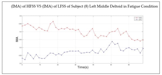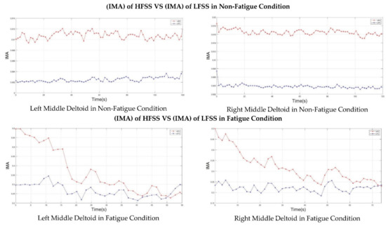 Furthermore, Figure 7 shows that the right middle deltoid required a longer time than the left middle deltoid to experience fatigue for the same subject. Despite the fact that the left deltoid muscle experienced fatigue at 50 s, the IMA values of both the HFSS and LFSS continued to change, where the IMA of the HFSS continued to decrease while the IMA of the LFSS continued to increase after the onset of fatigue. This was attributed to the ability of the subject to resist fatigue for a further period after the onset of fatigue.