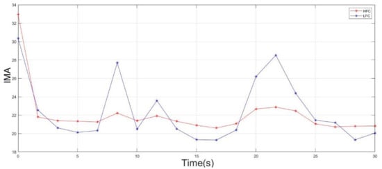 When in a fatigue state, Figure 7 shows that the magnitude of the IMA for both the HFSS and LFSS started to change and intersected at some point, which indicated the presence of fatigue. In other words, the fatigue index was transformed from a negative to a positive value because of the rapid decrease in the IMA of the HFSS and an increase in the IMA of the LFSS. The transformation in the fatigue index indicated the objective detection of muscle fatigue.