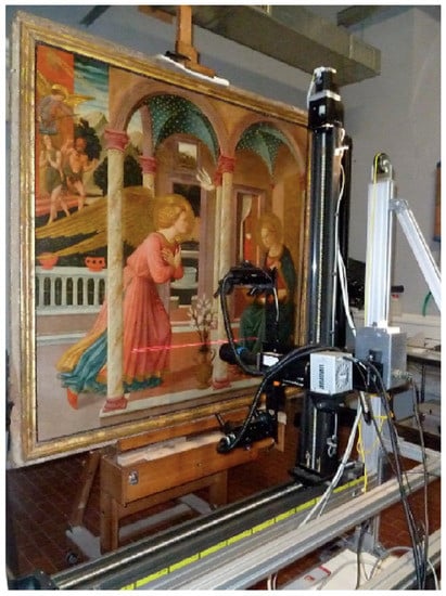- Carcagni, P.; Della Patria, A.; Fontana, R.; Greco, M.; Mastroianni, M.; Materazzi, M.; Pampaloni, E.; Pezzati, L. Multispectral imaging of paintings by optical scanning. Opt. Lasers Eng. 2007, 45, 360–367. [Google Scholar] [CrossRef]