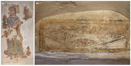 (a) Painting of a woman, from Tomb 3510 (Case Study 1). (b) Tympanum painting Imitation marble on the southeast arcosolium of Tomb 3882 (Case Study 2). The scanned areas of each painting are outlined in white.