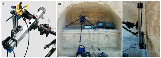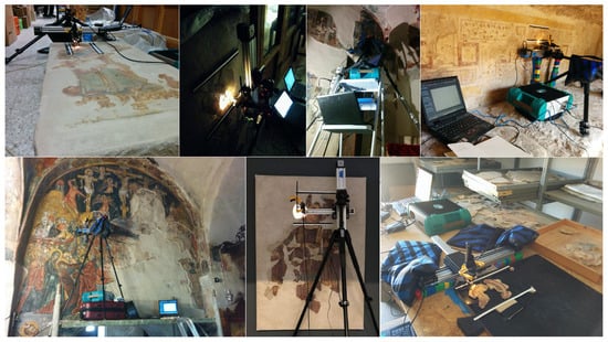 For on-site scientific analyses of archaeological wall paintings and other painted monuments, there is an increased interest for reliable, non-destructive, and non-invasive technologies to analyze painting materials such as pigments and binding media, understand painting production technologies, and identify regions of degradation and products of alteration as well as conservation materials from previous treatments [1,2,3,4]. These polychrome surfaces are challenging to study, as they are integral parts of walls and structures and therefore are exposed to anthropogenic and environmentally-linked events. Due to ongoing deterioration of the paint layers from aging, weathering, and biological effects, the decorated surfaces are left in a fragile state and suffer major paint loss, resulting in having trace amounts of colorants remaining or becoming obscured [5,6,7,8,9]. On-site analyses are further restricted by challenging physical spaces for large-sized equipment and have time constraints for the setup and study of the paintings, as they are often located in highly-visited tourist sites or serve religious purposes. To overcome these challenges, portable hand-held, point-based characterization techniques provide an effective solution for fast and reliable non-invasive field investigations of archaeological paintings. These include: reflectance spectroscopy in the near-ultraviolet (near-UV, here 300 to 400 nm), visible (400 to 750 nm), near-infrared (NIR, 750 to 1000 nm), and mid-IR (2.5 to 20 mm); X-ray fluorescence (XRF) spectroscopy; Raman spectroscopy; and Fourier-transform infrared spectroscopy (FTIR) [10,11,12]. Combinations of these techniques are often employed in tandem to provide complementary data for painting materials assignment [13,14,15,16,17,18]. While the information provided by these techniques is important, a comprehensive understanding of the high spatial variability of materials and complex stratigraphy of ancient wall paintings consisting of a single layer or multiple layers of paint composed of one or more colorants/pigments and the binding medium/media is restricted, as most robust techniques use spot analysis. Information on the extent of decoration and materials distribution is lacking through these approaches. Techniques capable of providing spatially-resolved data such as forensic photography (near-UV-induced and visible-induced luminescence, color, and NIR) using modified commercial color cameras or multiband imaging provide no or limited specific chemical data, though they can be used to visualize the distribution of some pigments. Diffuse reflectance multispectral imaging (MSI, tens of bands) [19,20] lacks sufficient spectral resolution and spectral bands to accurately identify and map artist’s materials, but can often be used to spatially separate many pigments.
