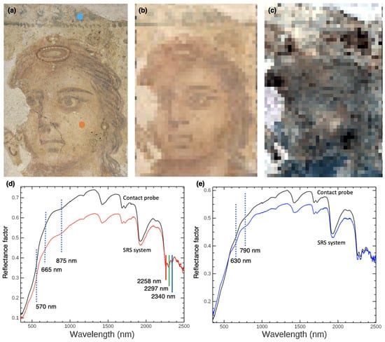(a) Color photograph of the face in Painting of a woman (192 mm × 141 mm). (b) Reconstructed accurate color image from the reflectance image cube. (c) False-color SWIR image with blue, red, and green bands at 2258, 2297, and 2340 nm, respectively (these bands are marked in (d)). (d,e) Full-range SRS hyperspectral system spectra (350 to 2500 nm) from select pixels (locations marked in (a)) compared with FORS contact probe measurements at the same location. Characteristic absorptions and inflection points are marked by the dashed lines. (d) shows reflectance spectra from the flesh tone (red dot) in the figure’s proper left cheek (red—SRS system, black—contact probe), which have spectral features of red ochre in the VNIR spectral range (570, 665 and 875 nm). Spectra in (e) are reflectance spectra from the aedicula (blue dot) featuring Egyptian blue (blue—SRS system, black—contact probe), identified by absorptions at 630 and 790 nm.