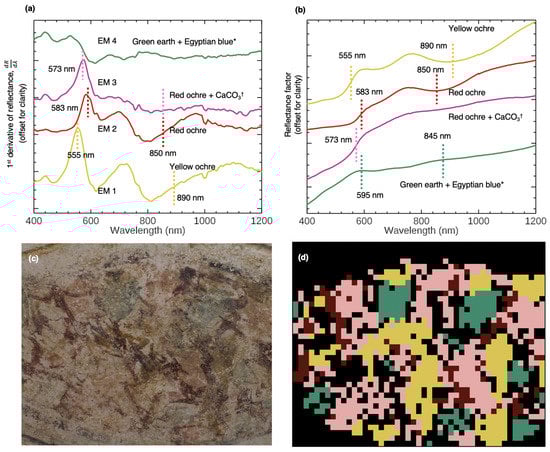 To better illustrate the capabilities of the system in unbiased identification and mapping of artists’ materials from the SRS image cubes collected on site, the painting Imitation marble in Tomb 3882, outlined in Figure 3b, was also analyzed. The scan area was 266 mm × 160 mm. Visual observations of the painting show that portions of the surface are weathered and contain encrustations. However, yellow, pink, red, and green paints used to create the marble decoration can be clearly seen. To find the endmembers of the pigments in the image cube, the analysis was focused on spectral features associated with electronic transitions within the 400–1200 nm range. Four unique first derivative endmembers were identified (Figure 6a), with their distribution visualized as a SAM map in Figure 6d. Single pixels in the first derivative cube that best match the extracted endmembers were used to identify pigments in the corresponding reflectance spectra (Figure 6b).