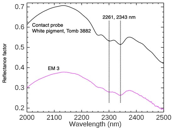 Comparison of the SWIR spectral ranges (2000 to 2500 nm) of EM 3, a mixture of red ochre and CaCO3, and a FORS measurement of a white pigment from a painted geometric design on another wall painting in Tomb 3882.