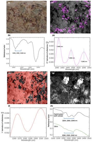 (a) Color image of the scan region of Imitation marble. (b) A SWIR spectrum from the reflectance image cube showing evidence of gypsum, identified by the triplet absorption from 1445 to 1540 nm and the water bands from 1940 to 1990 nm. (c) The SAM map of gypsum’s triplet signature (in magenta) using an endmember extracted from the second derivative-calculated cube subset from 1430 to 1563 nm (plotted in (d)), overlaid onto a greyscale image from the reflectance image cube. (e) The SAM map of PVA application over the surface of the painting (in red) using a first derivative endmember (plotted in (f)), overlaid onto a greyscale image from the reflectance image cube. (g) The MNF eigenimage from the PCA transform of the three broad spectral band images calculated from the SWIR portion of the image cube that shows the distribution of celadonite (in white). A reference SWIR spectrum from a local Cypriot green earth sample and the SWIR portion of EM 4 are in (h).
