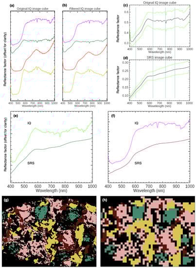 (a) The reflectance endmembers associated with those obtained from spectral analysis of the first derivative of the reflectance image cube of Imitation marble collected with the IQ hyperspectral camera. These endmembers are color-coded to match those obtained from analysis of the SRS image cube to allow comparison (see Figure 6b). (b) The four reflectance endmembers from (a) after filtering using an MNF transform on the cube. (c) An ROI was selected from the blue-green paint in the unfiltered IQ image cube from which the mean reflectance spectrum (the black curve) and the standard deviation (the green curves) were calculated. (d) An ROI was selected from the same region in the SRS image cube; the mean reflectance spectrum (the black curve) ± the standard deviation (the green curves) are plotted here for comparison. (e,f) compare the SRS image cube and IQ image cube reflectance endmembers for the blue-green and pink paint endmembers, respectively. (g) The IQ SAM map showing the distribution of the first derivative-cube extracted endmembers. (h) The SRS SAM map showing the distribution of the first derivative-extracted endmembers.