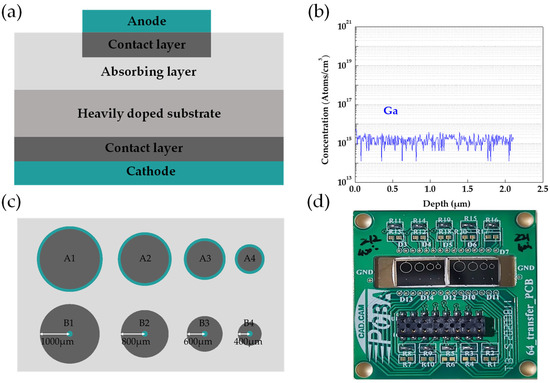 The absorption layer was fabricated by growing a 100 μm-thick Ge:Ga epitaxial layer on a highly conductive Ge substrate, with a Ga concentration of 1 × 1015 cm3. Figure 1b shows the secondary ion mass spectroscopy (SIMS) result of the Ge epitaxial layer. The doping concentration reached the expectation, and the doping Ga elements were uniformly distributed.