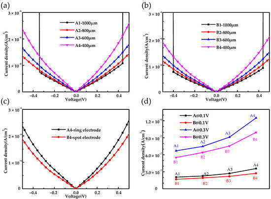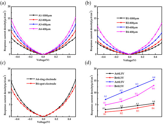 The dark current density-voltage characteristics of the Ge:Ga photoconductive detectors are shown in Figure 2. The current density is obtained by dividing the current by the pixel area. In Figure 2a,b, the dark current density-voltage curves under positive and negative electric fields are symmetrical, which is independent from the electrode structures (spot electrode or ring electrode). This indicates that the electrode and the device are well ohmic contacted. Meanwhile, the current density of A1 and B1 increased dramatically at 0.4 V due to the appearance of the avalanche breakdown effect. In addition, the current density of the detector increased as the pixel size decreased. This is because the ion implantation layer was thin and nonideal, and, thus, the electric field distribution was nonuniform, and there was electric field loss [23,24,25]. The electric field loss of large size detectors is greater than that of small detectors, so the equivalent electric field intensity of large detectors is smaller than that of small detectors. For the same reason, the equivalent electric field intensity of the spot electrode is smaller than that of the ring electrode. Therefore, the current density of the detector with a ring electrode was greater than that of the detector with a spot electrode, as shown in Figure 2c. Figure 2d shows the dark current density of the detectors with different structural parameters at 0.1 V and 0.3 V, and the phenomenon discussed above can be clearly seen from it.