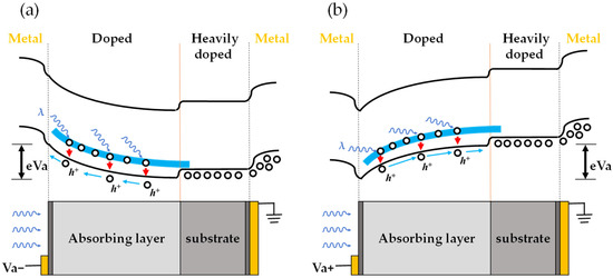 The schematic diagrams of the energy band structure and detection mechanism of the Ge:Ga photoconductive detector under negative and positive bias voltage are shown in Figure 4a,b, respectively. Under blackbody irradiation, electrons in the valence band were excited to the Ga-doped impurity band, thereby generating holes in the valence band. When a negative bias voltage was applied, the generated holes in the valence band were collected by the anode under the action of a negative electric field, thus forming a response current, as shown in Figure 4a. When a positive bias voltage was applied, the holes entered the highly conductive substrate under the positive electric field and then were collected by the cathode forming current, as shown in Figure 4b. The approximately symmetric blackbody response current density-voltage curves under positive and negative electric fields, shown in Figure 3, indicate that the doping impurity band of the highly conductive Ge substrate degenerated; that is, the doping concentration of the substrate was high enough that it had an extremely small resistance value and worked as a conductor, and the electrodes were well ohmic contacted.