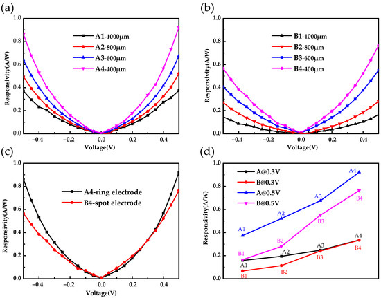 The Rbb of the Ge photoconductive detectors with various pixel sizes and electrode structures are shown in Figure 5. Figure 5a,b shows that the Rbb increases with the increase in bias voltage, and it increases with the decrease in detector size. The responsivity of the A4 detector with the pixel radius of 400 μm and the top electrode of the ring structure reached its maximum, that is, 0.92 A/W at 0.5 V and 4.2 K. Compared with the detector with the pixel radius of 1000 μm and the top electrode of the spot structure, the Rbb increased nearly six times. Figure 5c shows the Rbb of the A4 and B4 detectors at different voltages. For the same pixel size, the Rbb of the detector with the ring electrode was larger than that of the detector with the spot electrode at the same voltage. This is due to the fact that the equivalent electric field intensity of the detector with the spot electrode is smaller than that of the detector with the ring electrode. Figure 5d intuitively shows the Rbb of detectors with different structural parameters at 0.3 V and 0.5 V.