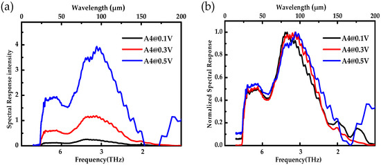 The spectral response intensity of the Ge-based photoconductive detector A4 at 0.1, 0.3, and 0.5 V are displayed in Figure 6a. The spectral response intensity of the detector increased exponentially as the electric field increased, which is consistent with the Rbb of the detector.