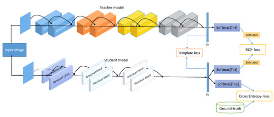 where Y is the ground-truth label, is the standard softmax output produced by the student, is the parameterized softmax output produced by the student, is the parameterized softmax output produced by teacher, and and are the loss weight hyper-parameters. Since the gradients of the loss are smaller than the gradients of the where the logits used for are divided by t, is multiplied by as suggested by Hinton et al. [40].