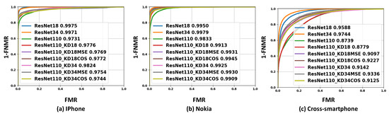 The results presented in Table 2 and Figure 3 illustrate that the verification performances of the ResNet-110 model were significantly improved by applying our proposed template-driven KD approach on the ResNet-110 training process in comparison to the case when ResNet-110 was trained with the conventional KD approach. For all verification scenarios, it can be observed from Table 2 that ResNet-110 trained with either cosine (ResNet-110_KD18COS and ResNet-110_KD34COS) or MSE embedding loss (ResNet-110_KD18MSE and ResNet-110_KD34MSE) outperformed the same model trained without KD and with the conventional KD approach. For the cross-smartphone verification scenario, the EER was improved from 21.87% (ResNet-110_KD18) to 17.53% (ResNet-110_KD18MSE) using MSE embedding loss and to 15.87% (ResNet-110_KD18COS) using cosine embedding loss. A similar improvement in the verification performance was achieved using ResNet-34 as teacher with template-driven KD, where the best achieved EER, in this case, for the cross-smartphone scenario, was 14.69% (ResNet-110_KD34MSE). For both Nokia and iPhone verification scenarios, the achieved verification performance by ResNet-110 using our proposed template-driven KD was significantly improved and even very close to the deeper models ResNet-34 and ResNet-18, as shown in Table 2 and Figure 3.