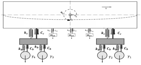 where δ (.) is the Dirac delta function, li is the distance (I = 1; 2), Fci stands for the forces derived from the secondary suspension corresponding to bogie i, and Fek represents the forces coming from the suspension of equipment (Equations (2) and (3)).