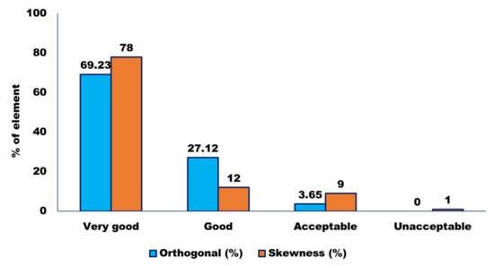 A mesh metric was validated using orthogonal quality and skewness quality. A significant (approximately 70%) number of the total elements lie in the ‘perfect’ zone, followed by the remaining (approximately 27%) number in the ‘good’ zone and a meager amount (approximately 3%) in the acceptable zone. A negligible number of elements fall in the ‘bad zone’, i.e., from 0.01–0.001. Since there are no elements in the ‘unacceptable zone’ of 0.001–0, the minimum value obtained is 0.0117. Thus, the mesh quality has passed the orthogonality test.