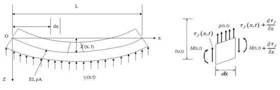 In Figure 4, L is the length of the beam, EI represents the flexural rigidity, ρA is the mass per unit length in which ρ represents the density, and A represents the cross-sectional area [63]. The micro-element movement equation and the beam moment equilibrium equation are as follows.