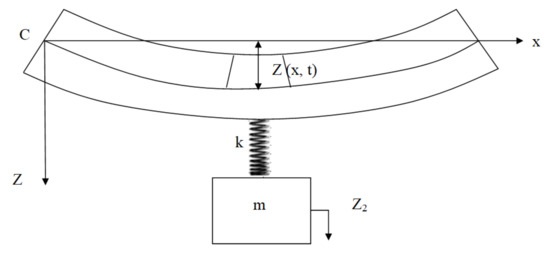 Based on the DVA principle, the equipment m was represented as a vibration absorber. The absolute coordinate of the motion of the absorber mass was z2, and the suspension stiffness was k [11,12,13,14]. The beam and a simple mass were then connected to form a coupled system, as shown in Figure 5. The distance between the suspended equipment and the car body end is assumed to be x, and the displacement is represented by z(x, t). Figure 5 depicts the overall model’s dimension and coordinate definition [13,39,64]. T and U denote the kinetic and potential energy of the linked system, respectively.