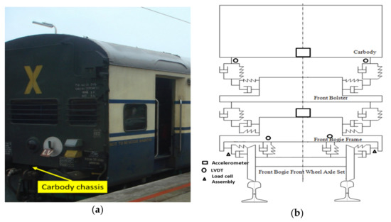 A full-size ICF coach of an Indian railway is considered for the modeling and simulation analysis. The rail vehicle’s mathematical model includes the CB, two bogies, four-wheel sets, and suspended equipment, as shown in Figure 1. They are mechanically linked in the primary and secondary suspension systems via springs and dampers [37]. An Euler-Bernoulli type free-free equivalent beam describes the CB with a constant section and evenly distributed mass.
