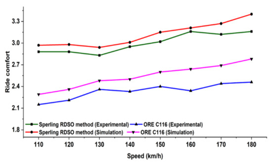 The sampling frequency of the frame acceleration is 2 kHz, and the passband frequency range is 0.5–12 Hz. The sampling frequency of the equipment acceleration is 1 kHz, and the passband frequency range is 0.1–200 Hz. The numerical model is validated through the oscillation trial conducted by RDSO on the actual condition. In particular, the ride comfort for passengers of the proposed numerical passive model is compared with the experimental results obtained by RDSO. The oscillation trials are on track tests with a prototype coach equipped and instrumented for recording acceleration, displacement, speed, and events.