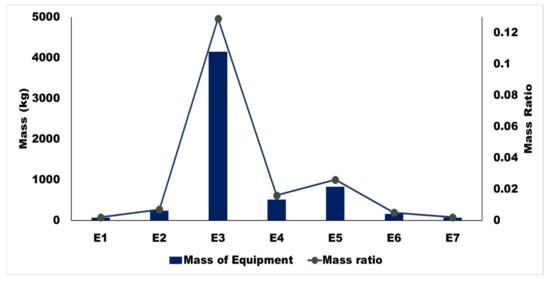 Before the calculation, the FEM was applied to obtain the modal modes of the CB without any equipment mounted. For example, taking an ICF passenger coach, there were mainly five mounted devices on the chassis with assorted positions. The devices weigh about 4.15 to 0.16 tons (see Figure 10), varying from the heaviest to the lightest and mass ratio, shape function, and optimized position from CB center and frequency ratio and optimum frequency of different equipment from E1 to E7. It was found that equipment suspension frequencies were close to the bending mode frequencies of a CB.