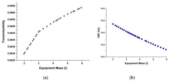 Elastic suspended equipment effect on CB mode due to equipment mass. (a) Transmissibility, (b) VBF.
