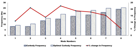 The dominating elastic deformation occurred up to a frequency range of 20 Hz. Hence, it was crucial to optimize these modes to get the better ride quality of the vehicle and ride comfort for human passengers. The relationship was developed between CB modal frequency and suspension parameters of underframe equipment to optimize those. The optimum suspension frequency of the equipment for suspension parameters is shown in Figure 12. The effect of that suspension parameter played a significant role in reducing the flexible vibration of the CB. Heavy equipment was mounted in the center and followed by light equipment, as heavy equipment played an essential role in surpassing the vibration. However, since excitation frequencies were likely to be in the range of 5–9 Hz, the modal analysis revealed two frequencies, i.e., 8.64 and 8.79 Hz. Moreover, the third mode was a vertical mode at a frequency of 12.14 Hz. Those modes showed a possibility of resonance in the vertical direction. Hence, the frequency needs to alter away from 5–9 Hz to avoid resonance. DVA equipment was optimized to improve the model frequency of the 1st, 2nd, and 3rd modes from 8.64 to 9.57 Hz, 8.79 to 10.63 Hz, and 12.14 to 14.06 Hz, respectively, to avoid the possibility of resonance, as shown in Figure 12. Moreover, it concluded that the % change in the model frequency of CB due to suspended equipment was about 13.65% for vertical bending (mode 3).