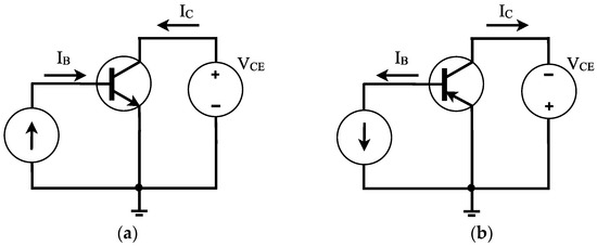 Figure 2 shows the typical bias for npn and pnp bipolar junction transistors: (1) a current source IB at the base-emitter junction; (2) a voltage source VCE between the collector and the emitter. A voltage source with a series resistor can be used to bias the base of the BJT rather than a current source, there is equivalence between them [8,10]; however, in this overview the current source is preferred for reasons to be appreciated later. It can also be seen that the standard symbols represent the flow of the conventional current at the transistor terminals, however it is known that the electron flow is in the opposite direction. The analysis will be based on taking the circuit of Figure 2, which is termed the common-emitter circuit because the emitter terminal is part of both the input signal (IB) and the output signal (IC). In this article the common-emitter configuration will often be used.