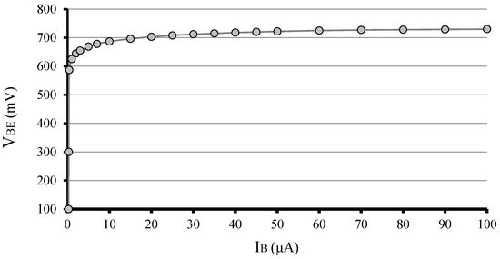 To understand how a BJT works, at this point it is interesting to take a simplified approach. First, consider that the BJT is npn type, and the understanding for the pnp it must be to reverse the polarities and exchange electrons for holes. Initially, assume that the base current bias is zero (IB = 0). This is equivalent to saying that the potential difference and current is zero at the base-emitter pn junction (JBE), a condition called electronic equilibrium, at the pn junction [5]. This is also equivalent to saying that the base of the transistor is in the virtual ground (a short circuit between the base and the emitter) and the BJT works like a diode. In this case, there is only the reverse bias (VCE) at the base-collector pn junction (JBC), so the collector current (IC) is minimal, in fact practically negligible, because it is an ultra-low leakage current due to the temperature or generation-recombination of charge carriers, for a while. This electrical state (a so-called cutoff) is like an open switch, or it can be said that the electrical resistance between collector and emitter is extremely high (RCE ≈ GΩ or RCE ≈ TΩ). Now, in applying a current source bias to the base of the transistor (IB > 0), there is a direct bias at the JBE, where a base-emitter voltage VBE appears, normally referred to as the built-in pn junction potential, Vpn [5]. For a typical silicon BJT, the value of VBE can be approximately between 0.3 V to 0.8 V depending on the current intensity (nA to mA) through the JBE, and in general an average value of 0.7 V can be considered for current values in the order of µA. Actually, in the 1960s and 1970s, the radios and TVs that operated with transistors had electrical currents of the order of microamperes in their electronic circuits, and for this reason the engineers used the value of VBE = 0.7 V as a practical value to design an electronic circuit. Figure 3 shows an experimental curve of a 2N3904 BJT for VBE × IB, with VCE = 5 V, and it can be seen that there is a base current value at which the voltage VBE ≈ 0.7 V becomes practically constant, like a diode curve if the position of the axes is changed. The curve was obtained with a 2450 Keithley source-meter, in the operating mode called SIMV (current-source and voltage-measurement).