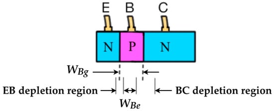 Now, if the base current IB is kept constant, although electrons are the minority charge carriers injected in the base region (for npn BJT), the presence of electrons will maintain a concentration of negative charges there because the hole concentration is lower and there also is electron-hole pairs recombination, and this dynamic of charge carriers in the base modifies the electric field configuration (and consequently the potential configuration) within the innermost transistor structure. Figure 4, which was designed based on the didactic structure of a BJT (Figure 1), is intended to illustrate what is called the neutral base region WBe (or effective base region) [8], in which the size corresponds to the limits of the depletion regions of the two pn junctions. In this illustration, WBg (or simply WB) is the geometrical base width, which is usually a constant value and normally determined by the transistor fabrication conditions [5].