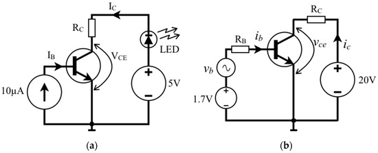 The BJT device can operate in different modes, and the circuit of Figure 7a aims to clarify this topic considering β = 200, RC = 1 kΩ, and assuming that the voltage of the LED in direct bias is constant, Vpn = 1 V. As seen above, if IB = 0 the LED of the circuit is turned off because the transistor is in the cutoff state (as an open switch), and consequently IC ≈ 0. Whereas if IB = 10 µA, for example, then IC goes to 2 mA and the LED lights up. Precisely in this case one can assume that the operation point of this BJT is IC = 2 mA@VCE = 2.0 V, since Vpn(LED) = 1 V and VRc = 2 V, and it naturally amplifies the base current so one can say the bipolar transistor is in active mode. If one wants to calculate the power dissipated by the BJT: PT ≈ VCE·IC = 4 mW. Now, increasing IB just to 25 µA, then IC tends to go to 5 mA; however, what is obtained as a result of the measurement is IC ≈ 3.86 mA@VCE ≈ 0.14 V. In this case, we must note that IC < β·IB, and it is said that the transistor is saturated, with VCE(sat) = 0.14 V, which produces VRc = 3.86 V. For the BJT, such an electrical state (so-called saturation) is like a closed switch in which the LED is turned on with the maximum brightness possible for this circuit because the VCE of saturation is reached, and consequently IC also reaches its maximum value. When a BJT acts exiting from the cutoff to the saturation (or vice versa), it is said that the transistor is operating as a switch: the LED, which was off, turns on (or vice versa). Normally, the transistor operates in active mode when neither is cutoff or saturated, and the equation IC = β·IB is then true. Figure 6 shows that the transistor is saturated for practically VCE < 0.5 V [10]. In fact, an electronic engineer designs a sound amplifier circuit so that the BJT is in active mode, so the operating point is kept away (1) from saturation voltage (VCE > VCE(sat)); and (2) from the cutoff region so that it avoids the harmonic distortion in the amplified sound, for example.