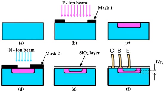 Firstly, an n-type silicon chip is exposed to a beam of positive ions to produce the p-type base. The ion diffusion depth can depend on both the energy and the dose of the particle beam applied to the chip. In turn, the ion implantation dose is correlated to the particle intensity and time at which the semiconductor material is exposed to the beam [12]. Also, other aspects inherent to the manufacturing process, as a heat treatment, must be taken into account [15] to provide annealing and minimize semiconductor defects, for example. Secondly, the chip is exposed to another beam of negative ions, and to indicate that the concentration of negative particles in the emitter is larger than in the base, it is usually called an n+ doped emitter. Note that in this simplified process the geometrical base thickness, WBg, corresponds to the distance between the interfaces of the two pn junctions. There is also a step called the surface passivation process (it could be the first step). Such a step consists of depositing a layer of inert material (often SiO2) on top of the chip to protect against changes in the electrical properties of the semiconductor materials. After these initial manufacturing procedure steps of the npn structure, metallization is performed in order to be able to connect the metal wires on the chip. These metal wires, which are often gold, will also be connected on the device’s external metallic terminals, as can be seen in Figure 9.