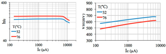 First of all, according to the electron energy band theory of semiconductor crystal, at room temperature, the effect of lattice vibration produces the generation of electron-hole pairs. So, for intrinsic or extrinsic silicon, when the temperature rises it will result in a combined increasing in the conductivity of electrons and holes. The effect of temperature on a BJT can be found in its datasheet and Figure 10 presents graphs obtained with a 2N3904 BJT for two temperature values (see [17] for more values). Notice that both hFE, IC and VBE are a function of temperature [10]. In addition, it is also observed that each variable depends on the other. As mentioned in the introduction, there are several references containing equations that correlate currents and voltages in the BJT. It is clear that the temperature variation can make the BJT output signal become noisy. In practice, when an engineer designs an electronic circuit with BJT, there is always an electronic component or a small circuit connected to it (as a feedback circuit) providing compensation for the temperature effect. However, if the ambient temperature practically does not vary, as in a typical laboratory, then there is no need for such a compensation circuit.
