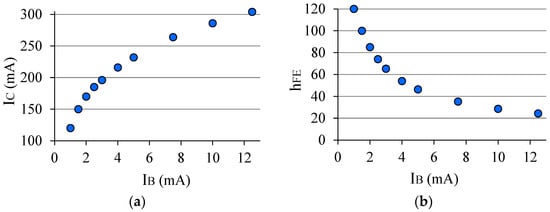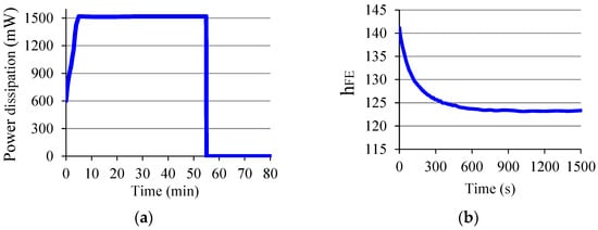 The transistor chip may experience mechanical stress during the packaging process, causing changes in the device’s electrical properties [23]. However, what matters most here is the electrical stress, then a brief comment on this subject will be made. There are some conditions that cause electrical stress in a BJT, for example, high base current, reverse bias VBE, voltage spikes, etc. Toufik [24], in his work, demonstrated the degradation in the BJT gain due to the reverse bias to the JBE. Here in this paper, a BJT (2N3903) was kept for 50 min with VCE = 5 V and IC ≈ 304 mA, dissipating the power of PD ≈ 1.5 W, which is above the maximum allowed for the device, and for this it was chosen to exceed the maximum collector current, which is IC = 200 mA [25]. Figure 12a shows how IC varied in the first five minutes, and Figure 12b shows how hFE varied during this slow warm-up. Figure 13a shows the curve of the power dissipated by the BJT in the time of electrical stress (50 min). The graph of Figure 13b corresponds to hFE immediately after the stress period, when the temperature was 115.4 °C in the BJT package. Table 1 brings some initial and final parameters of the BJT. The final gain value was taken 25 min after the electrical stress period in which the device was kept at room temperature. As can be seen in the graph (Figure 13b), after such an electrical stress condition, hFE increases, unlike what is seen in the case of the electrical stress caused by the reverse bias to the JBE observed by Toufik [24].