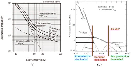 (a) Photon interaction probability for silicon [26], courtesy of Hamamatsu Photonics (K.K.); (b) Cross section of photons in Carbon [34].
