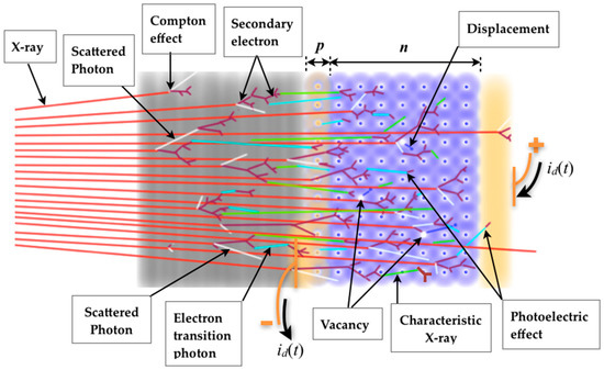 In fact, the Compton scattering is predominant for the energy range used here, however both scattered photons (which have lower energy) by the Compton effect and characteristic X-rays can contribute to the photoelectric effect as well. Such electron rain from the device package and chip itself produce pairs of electron-holes in the semiconductor device, and consequently a flow of charge carriers appears due to the electric field at the pn junction: id(t), the device current [35].